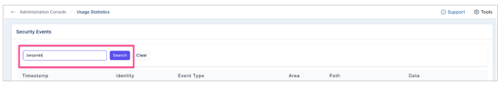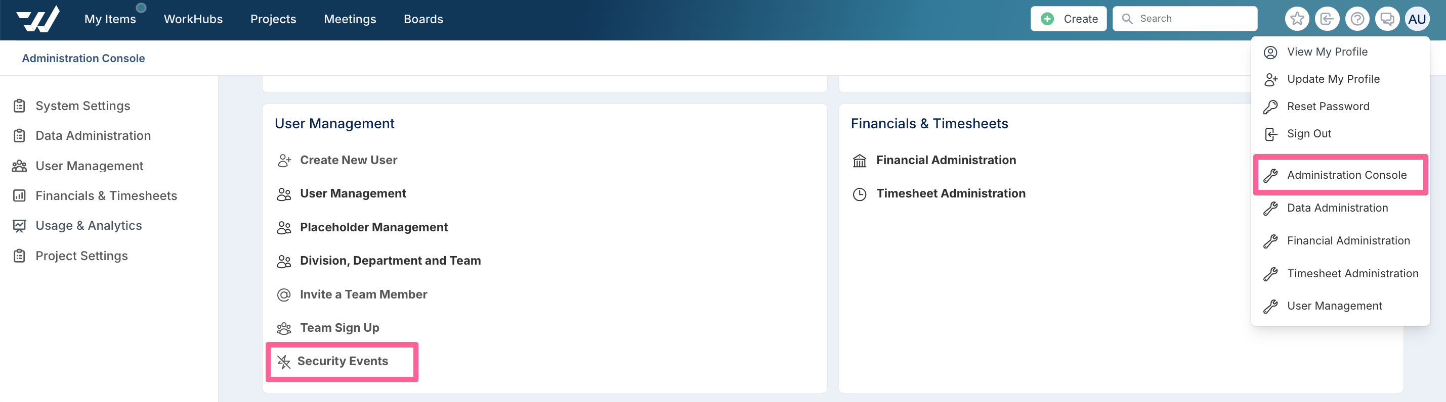 To access the page, simply navigate to the Administration Console page and select the Security Events option under the User Management section.