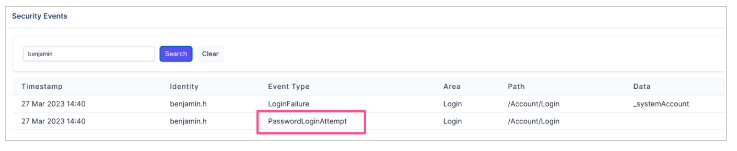 The security events page provides detailed information about each login event, including timestamps, identities, and relevant context.