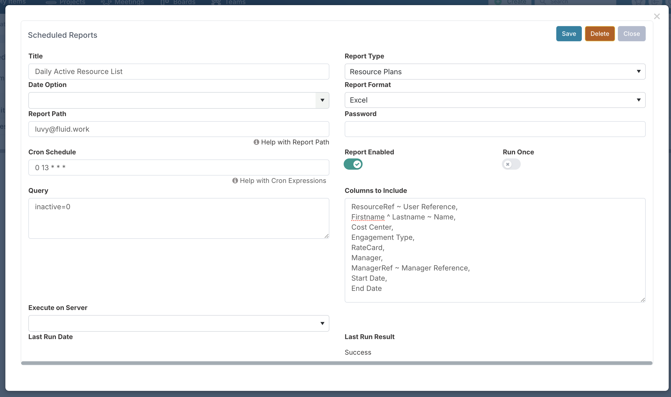 Columns to include | Use this field to control which columns are returned in the scheduled report export. Unlike Export to Excel reports, where the columns are fixed, scheduled reports let you: