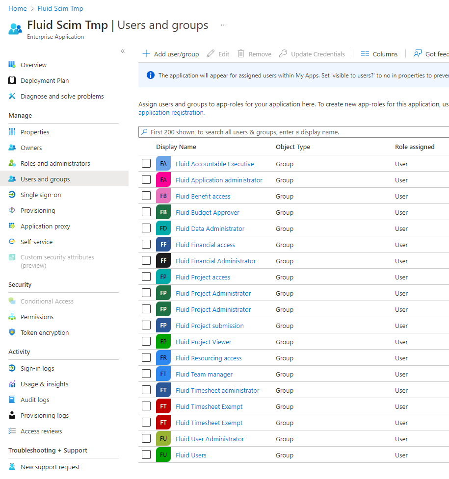Once you have configured SCIM identity synchronisation, see Setup SCIM Identity Syncronization (Azure AD) you can optionally manage Fluid security roles and license types from AD. Users are assigned to specific groups in Active Directory which are in turn mapped to user roles or license types within Fluid.