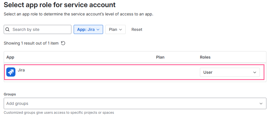 Select the Jira app, this is the app we want to have access to and under Roles select the User role.