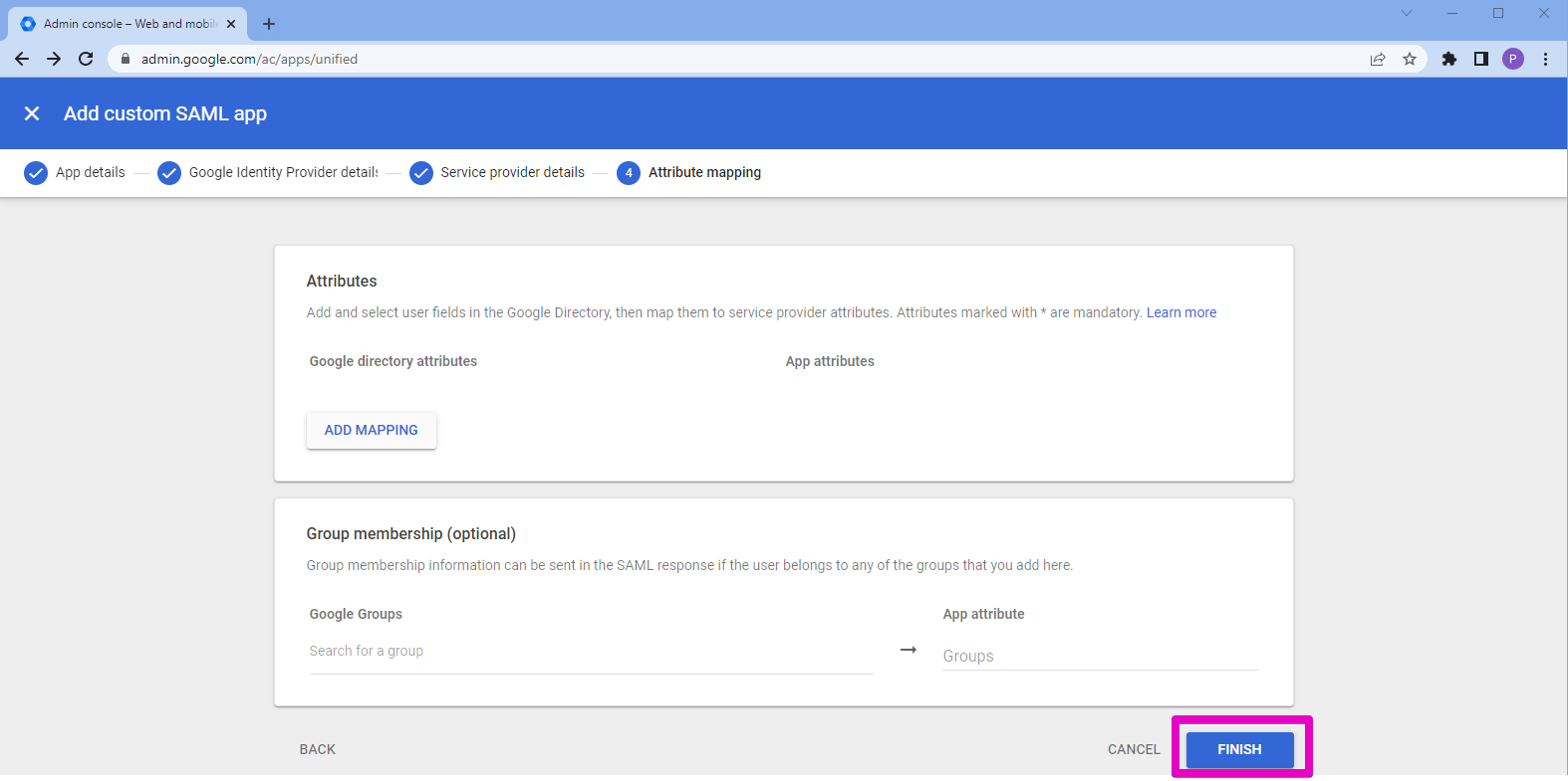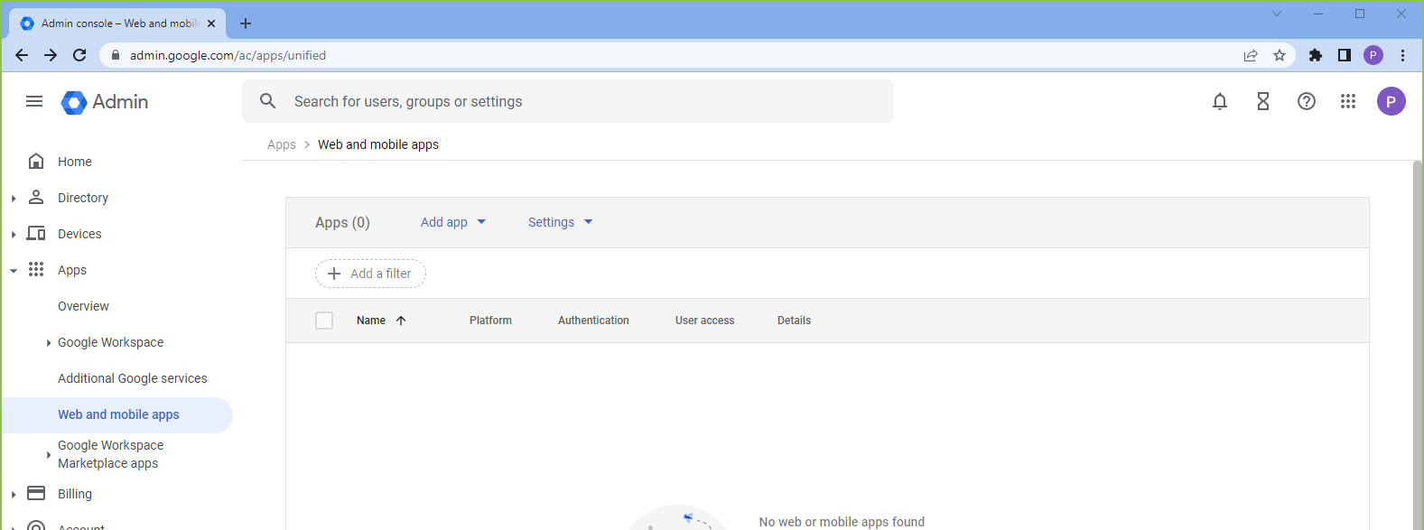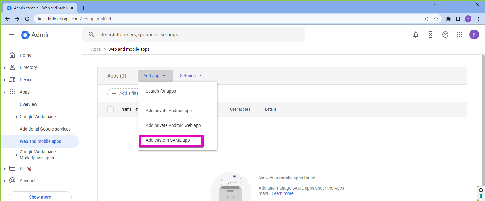 1. In Google Admin console Navigate to Apps -> Web and mobile apps.