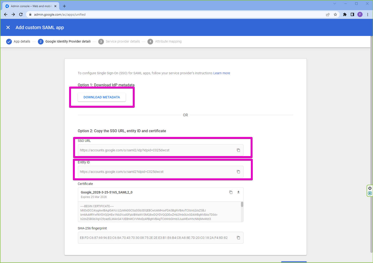 IDP Entity ID - Enter the value that was copied to notepad from Google.