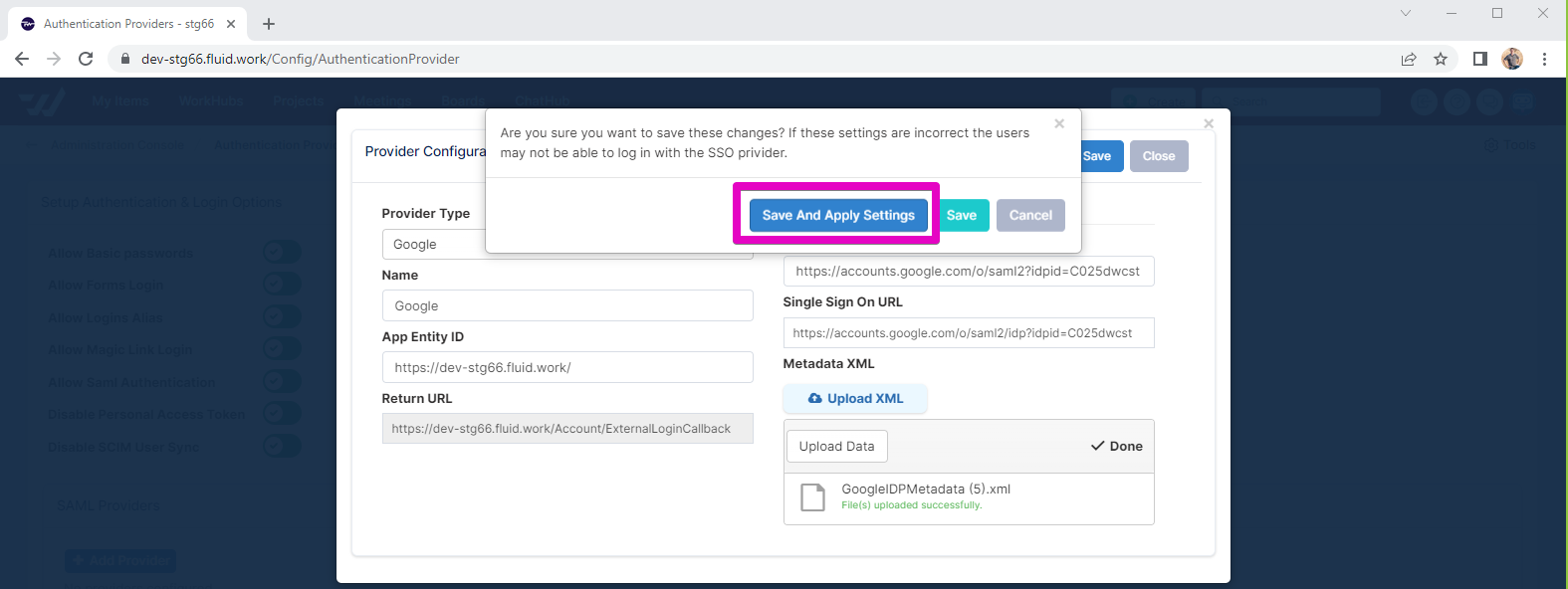 8. Click Save and Apply Settings to restart the instance with the new provider. Please allow 5min for the system to restart.