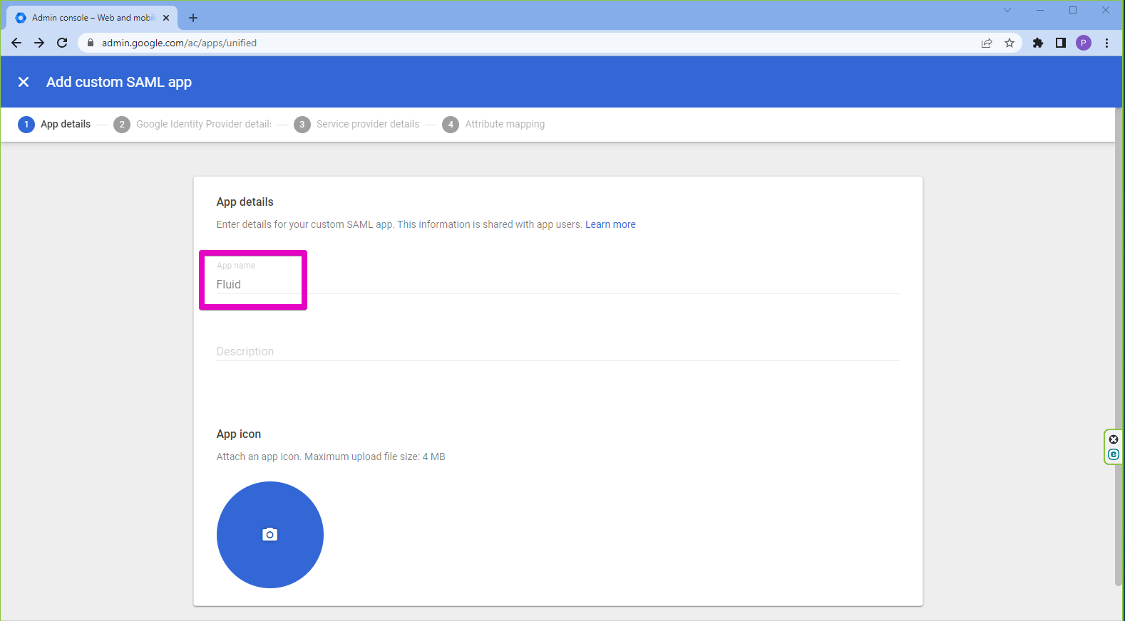 Name - Enter a friendly name that users logging into Fluid will be presented with, ie: Google
