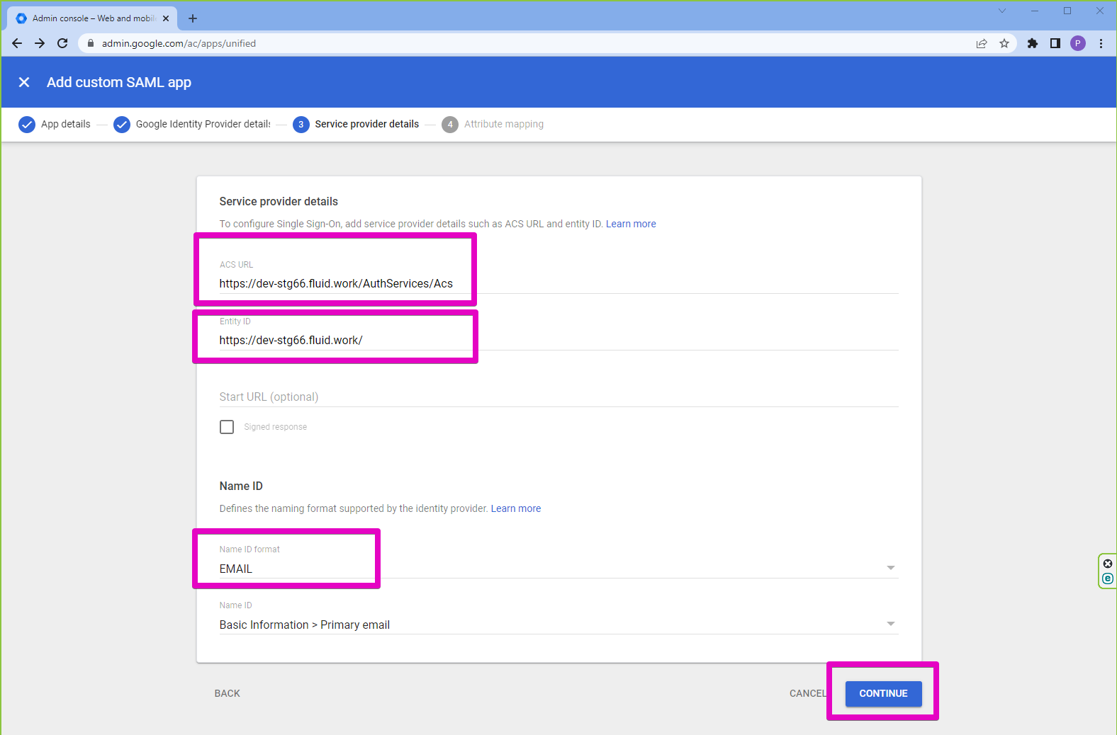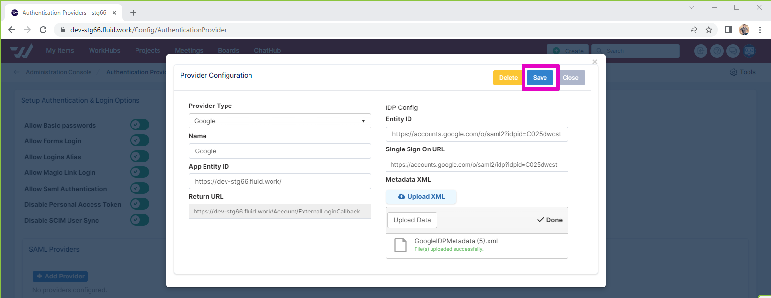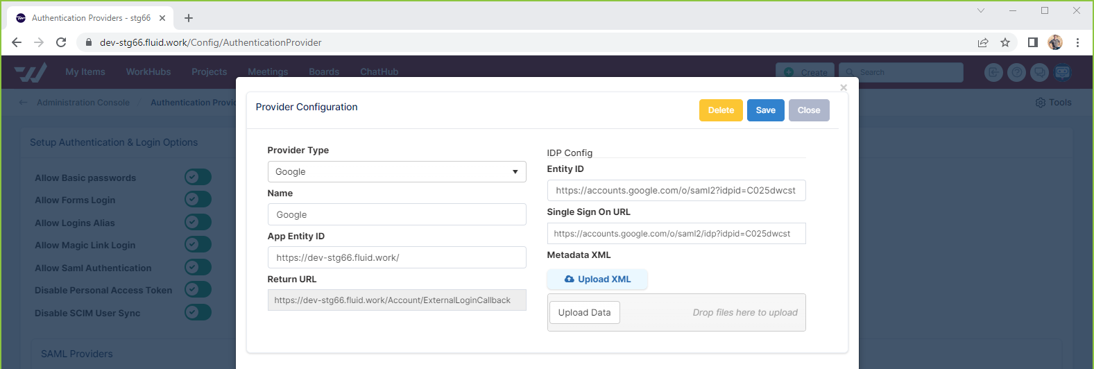 The instructions below explain how to setup Fluid and Google to create an SSO app in Google and then register the App within your Fluid instance. This will enable users to login into the Fluid instance using their Google credentials.