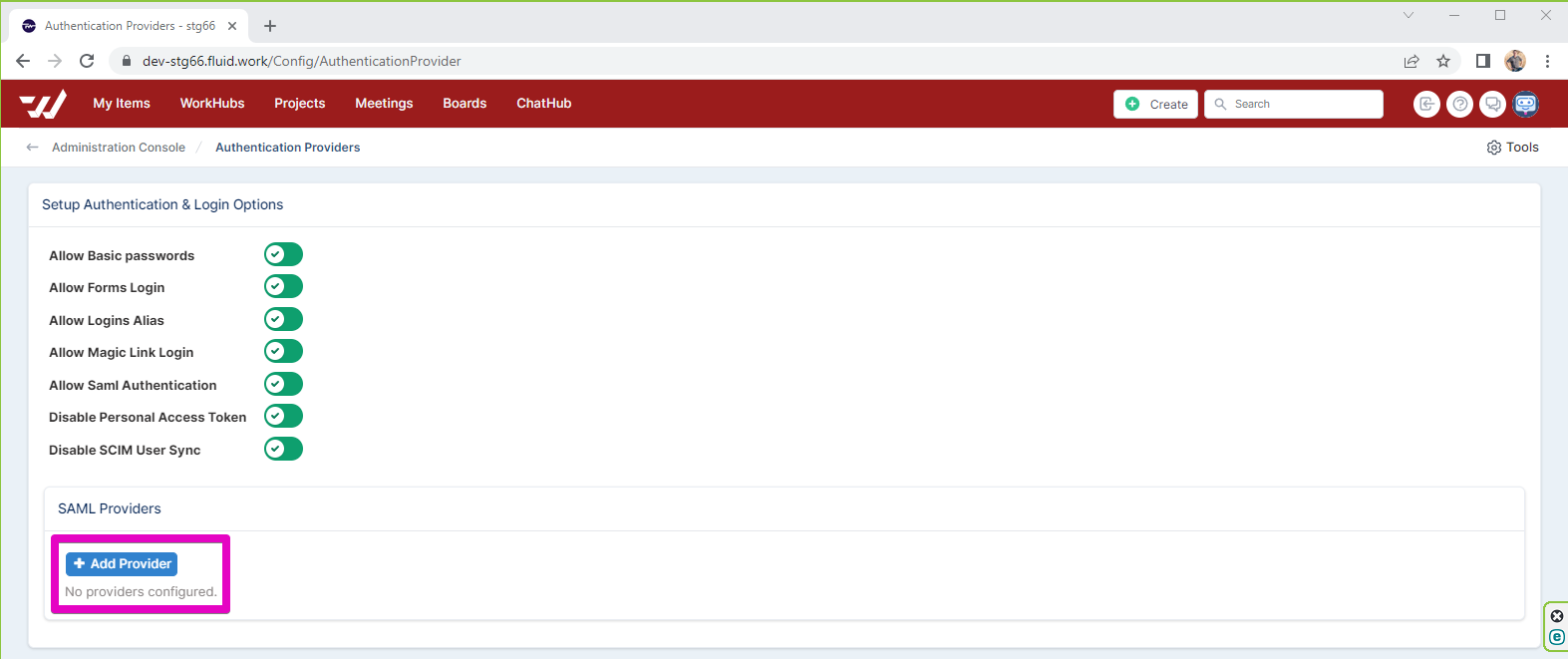 7. Navigate to your Fluid instance. Click on your Avatar on the top right hand corner of the page. Select Administration Console from the drop down. From the Administration Console select Authentication Providers.
