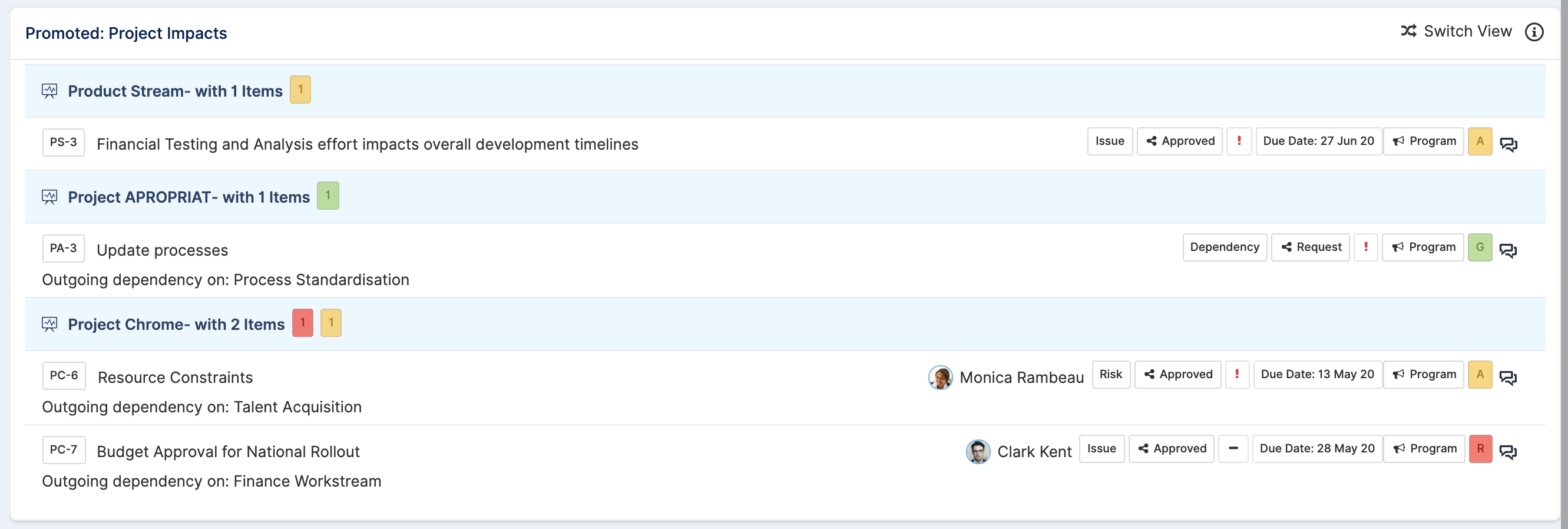 A new watchlist that displays project status along with promoted impacts is now available. Use this watchlist if you want to see at a glance the list of risks, issues or dependencies of your projects.