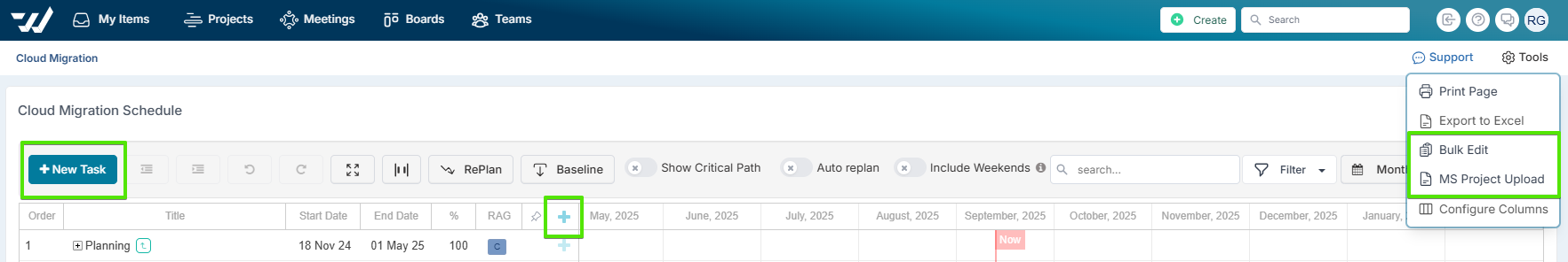 MS PROJECT FILE UPLOAD Import your MS Project Plan using .mpp, .mpt or .xml files, under Tools at the top right of the screen. You can find more details about Microsoft Project Upload here.