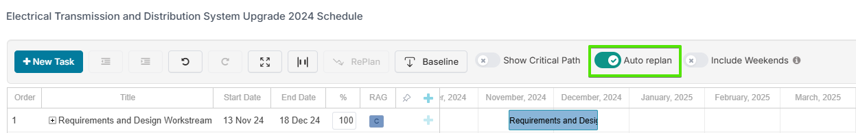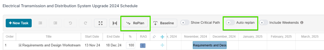 With Replan, auto replan option is disabled to allow more control of adjusting dependent tasks.