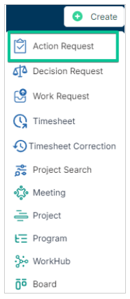 The drop-down menu provides you with the option for creating a Action Request as the first option.
