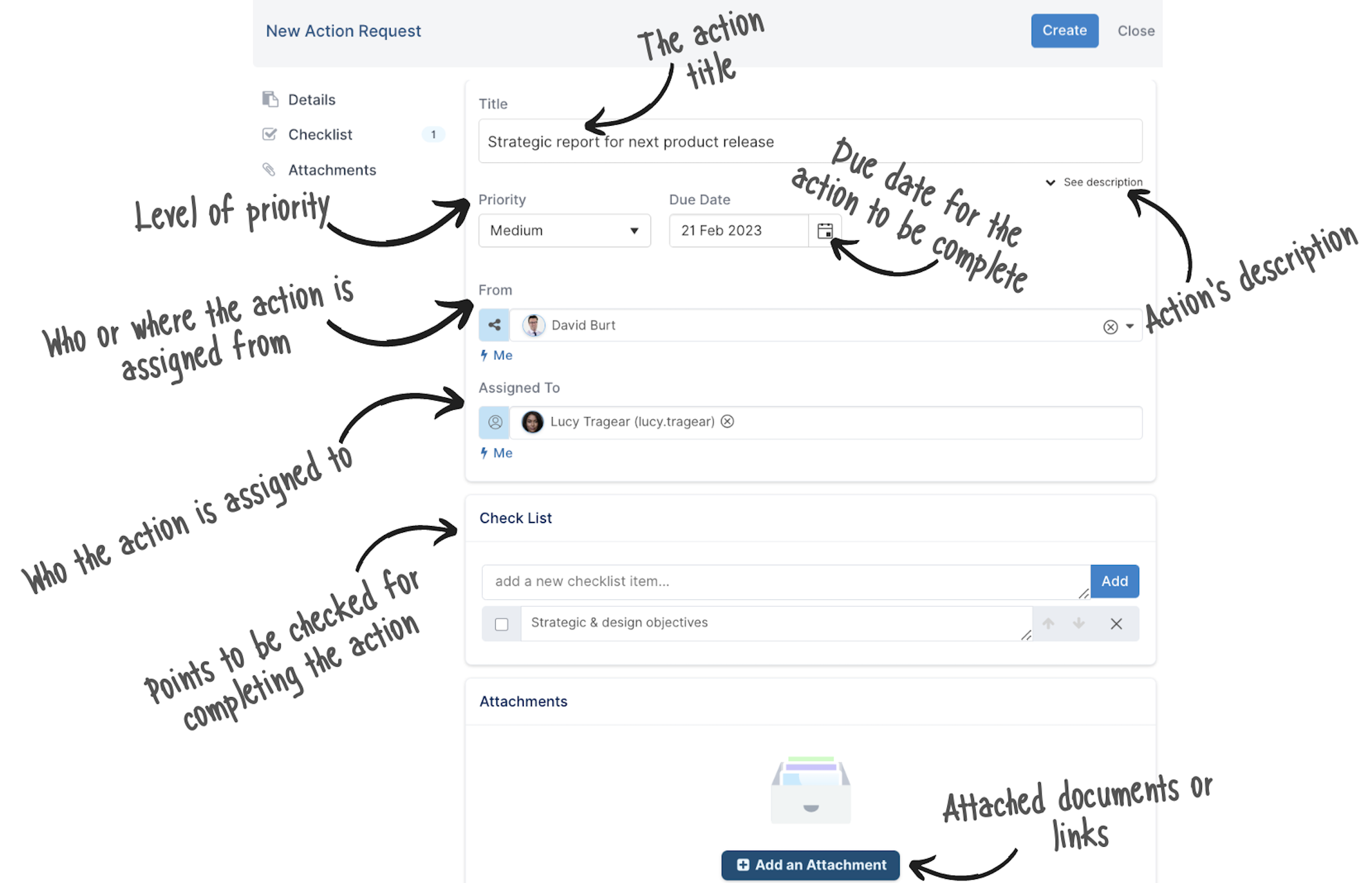 Once the relevant fields have be completed/filled in, click on Create to send/assign the action to the individual/s required to execute the action.