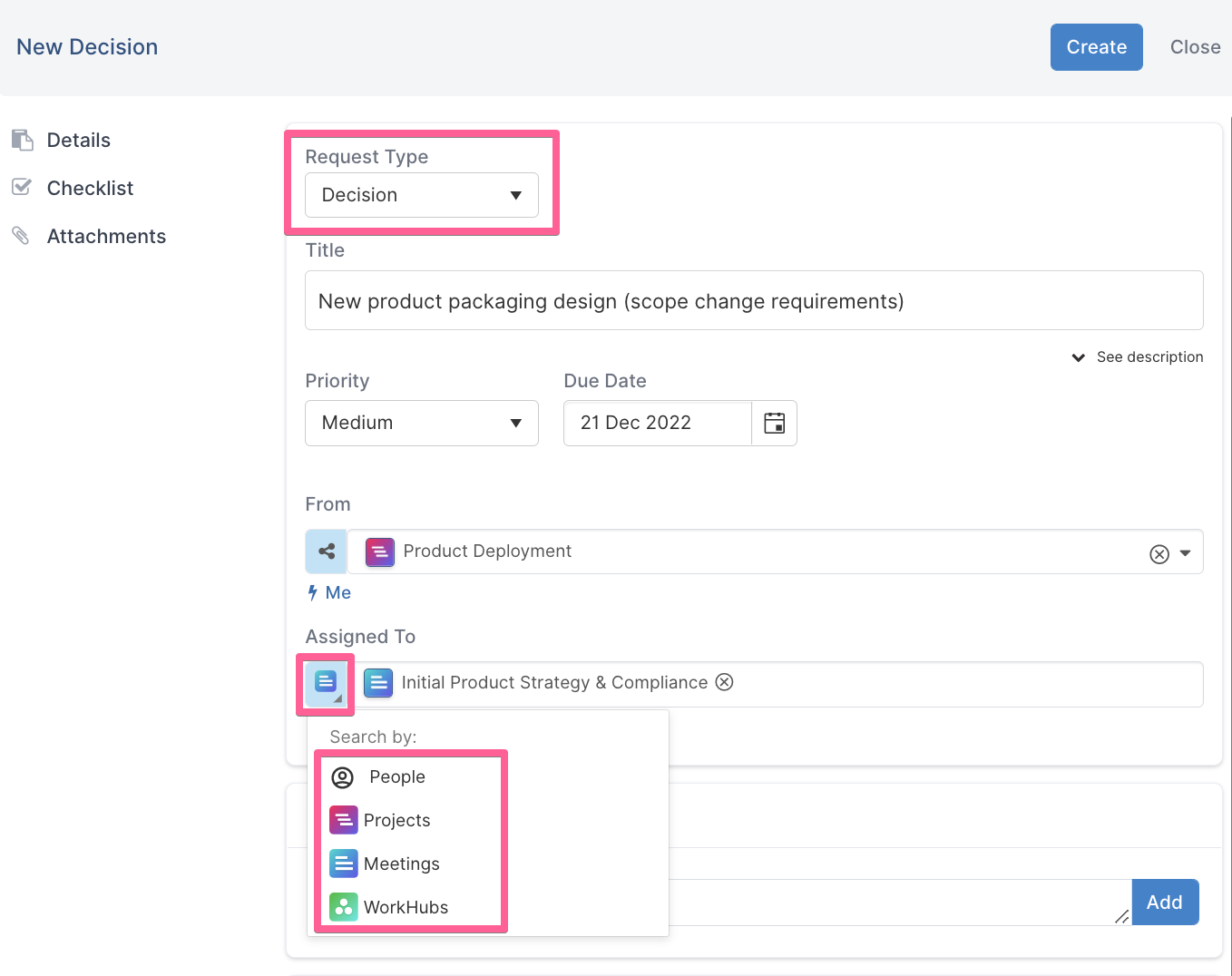 Once the dialog opens, select the Request Type (either Action or Decision) and assign it to either a person, or module in Fluid. In this example, we'll assign it to a meeting. The filter on the Assigned To field will allow you to search by module to assign the action/decision.