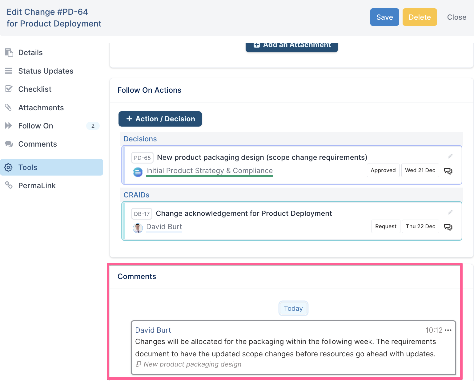 In the follow-on section of the impact's dialog, the project manager can also review the status of the decision ("Approved" in this decision example) along with the due date to assist with audit details.