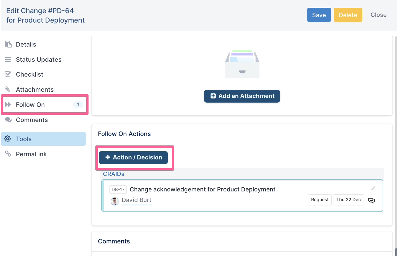 Open the change request's dialog and navigate to the Follow-on section to create the action/decision by clicking on "+ Action/Decision".