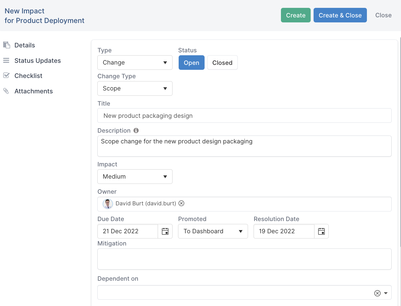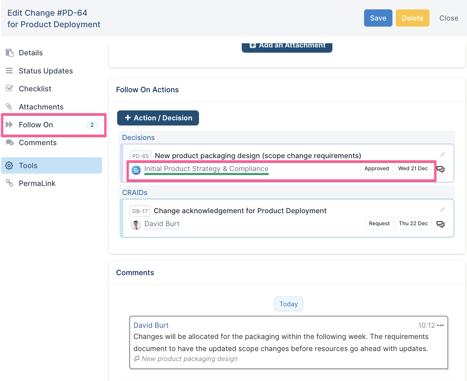 Using the example of an impact/change request requiring discussion in a project meeting, the following steps will show you how to create the follow-on action/decision and how to track the updates/developments.