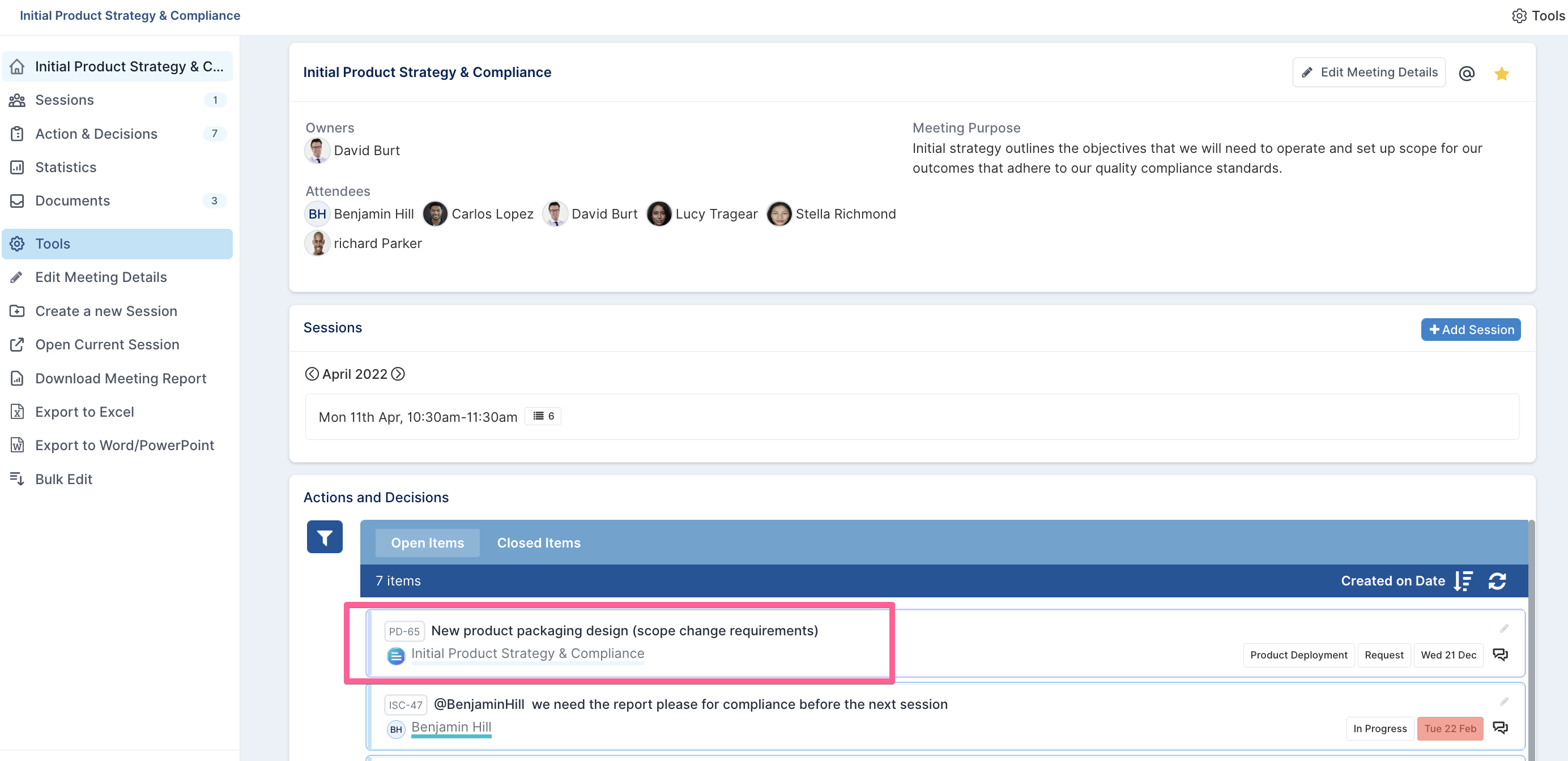 The decision will be displayed under the actions and decisions dashboard of the meeting.