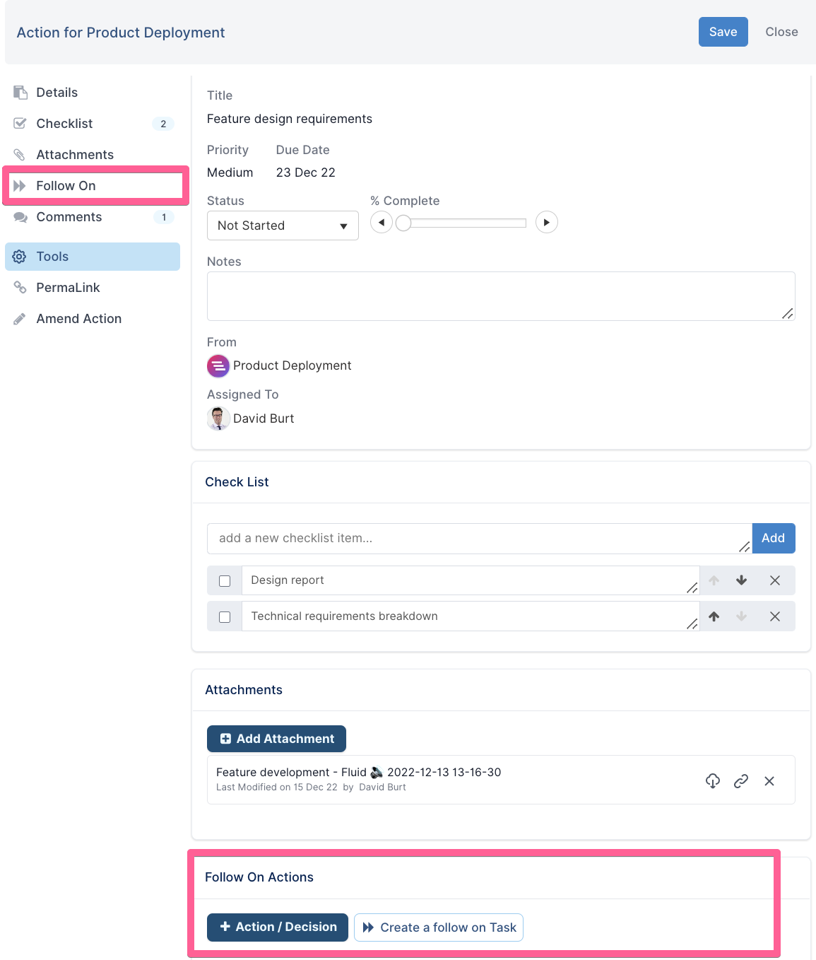 NOTE: Follow-on actions and decisions can be created directly from all action/task dialogs across all modules in Fluid. Each action/task created in Fluid will have the Follow-On section on the task dialog, from where the follow-on actions/decisions can be created and tracked.