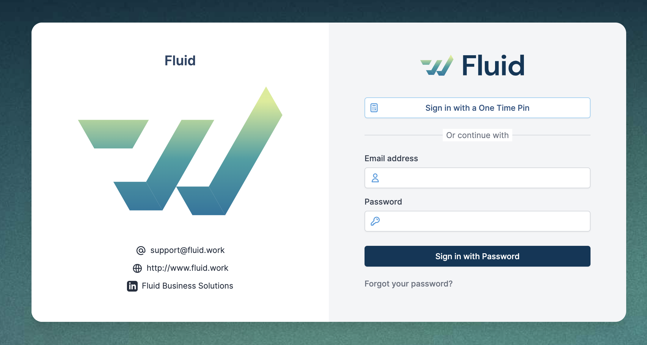 You may login to Fluid using a one time pin. This feature may be useful when you have forgotten your password, or if you do not have an Single Sign On account.