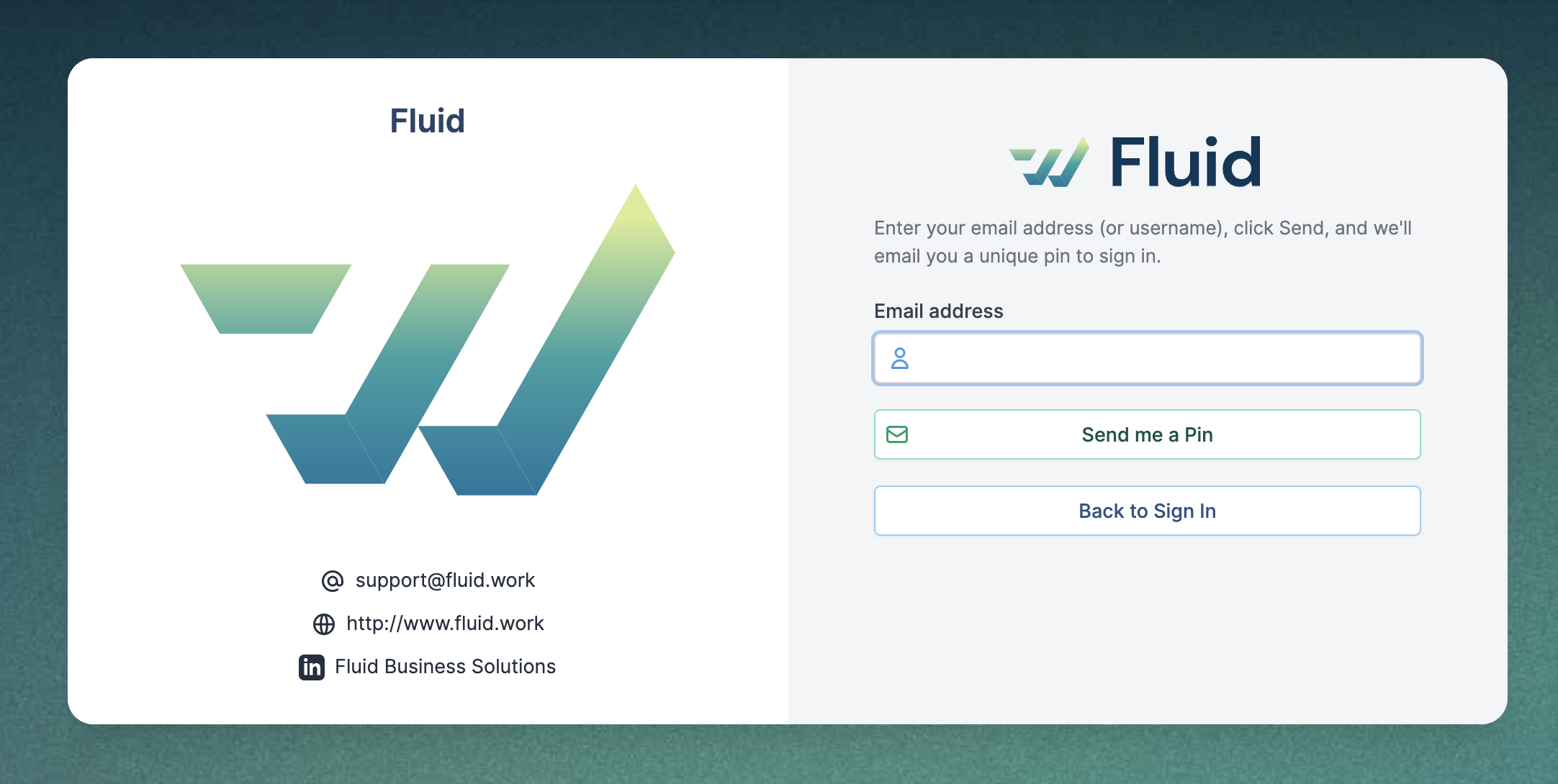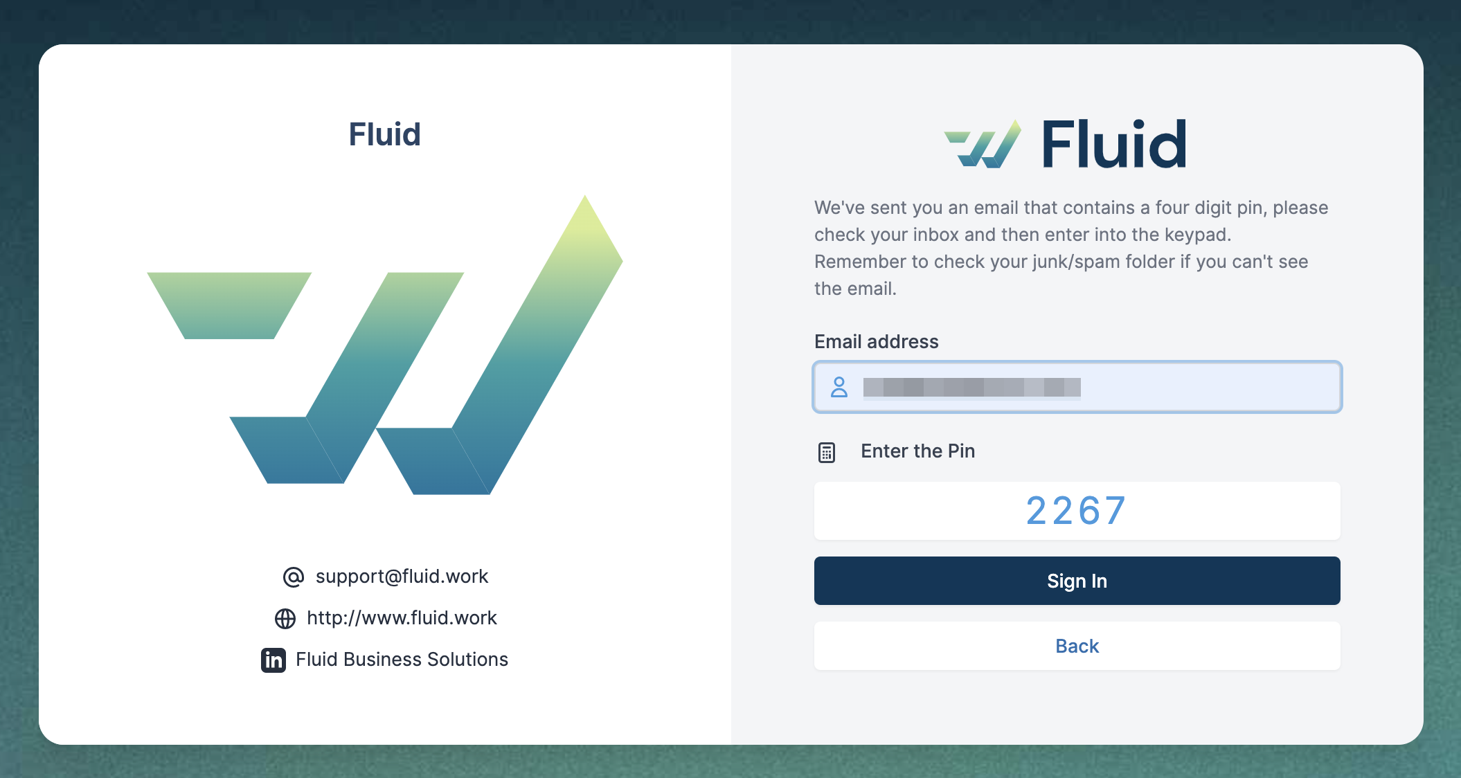 The pin is sent to the registered Fluid user's email account.