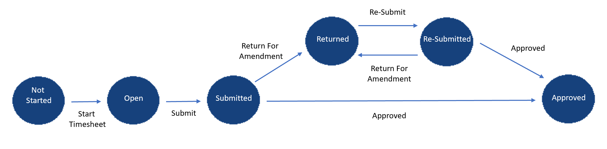 Timesheets follow a structured workflow, ensuring that time entries are accurately recorded, reviewed, and approved. Each timesheet progresses through a series of statuses, reflecting its stage in the submission and approval process. Understanding these statuses helps users track their timesheets and take the appropriate actions when needed.
