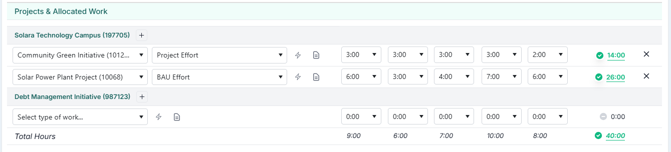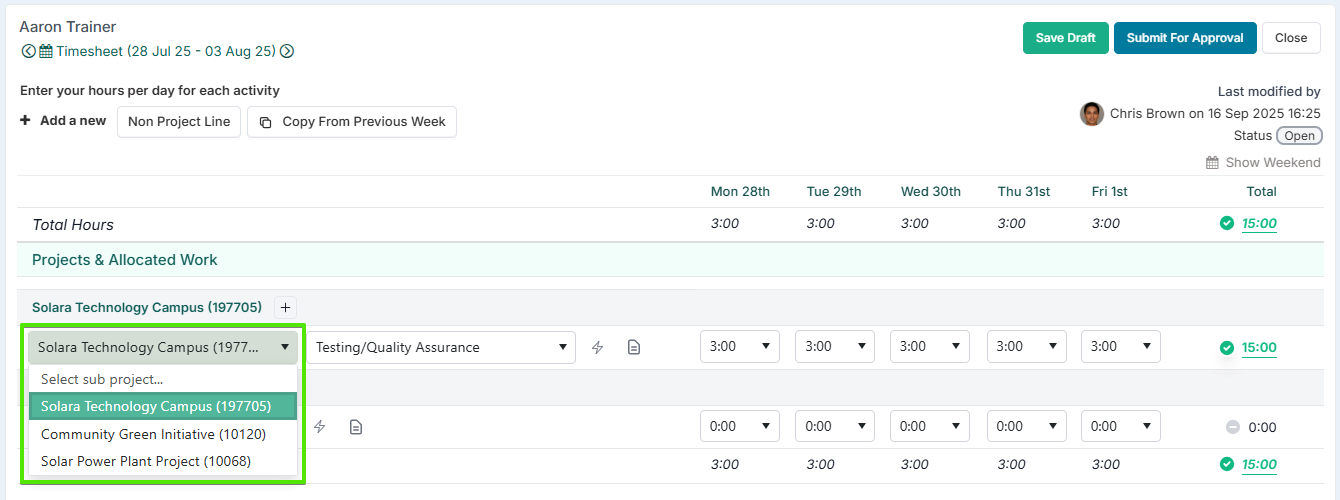 Once Sub-Project Time Booking is enabled, resources can easily log their time within their timesheets: