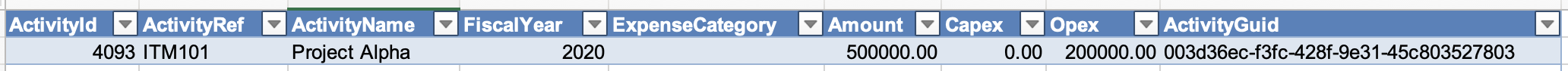 A. ActivityId | The project Fluid unique ID. | Number | If the ActivityRef value (column B) and the ActivityGuid value (column I) are blank too, the row will be skipped as the project to apply the funding to cannot be uniquely identified. |