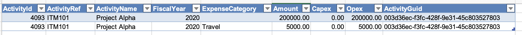 As an example, if the file shown in the first screenshot below is uploaded and then the file in the second screenshot is uploaded afterwards, both records originally uploaded for the 2020 fiscal year are deleted and replaced by the new record. This means the project will no longer have a funding amount for the Travel expense type.