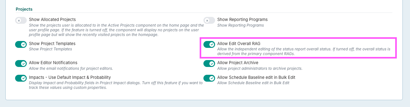 Scroll down to the 'Projects' section. Here you will see the 'Allow Edit Overall RAG' settings toggle.