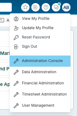 First click on your profile icon in the top right corner and select 'Administration Console' from the menu.
