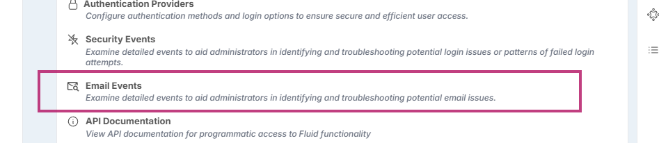 Fluid Administrators can review outbound emails using the Email Events Admin console page.