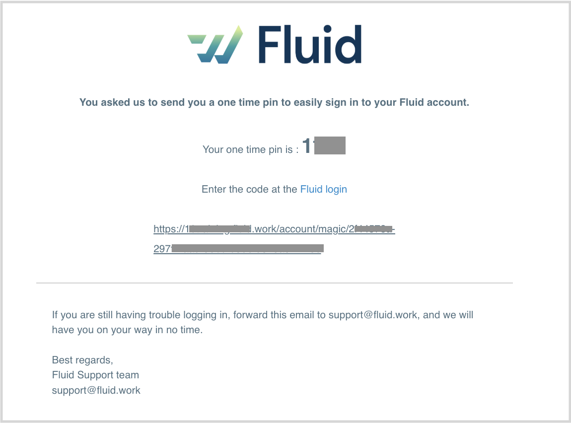 Trigger: Sent when a user requests a one-time login PIN from the Fluid login page and their account is active.