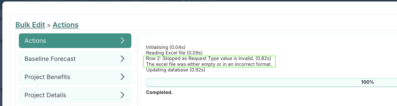 Important: Remember, when you upload a row in a bulk edit file that has no GUID, Fluid will create a new project benefit with those details. If you have already added any of the project benefits in Fluid, remove them from the file so that you do not create duplicate the project benefits.