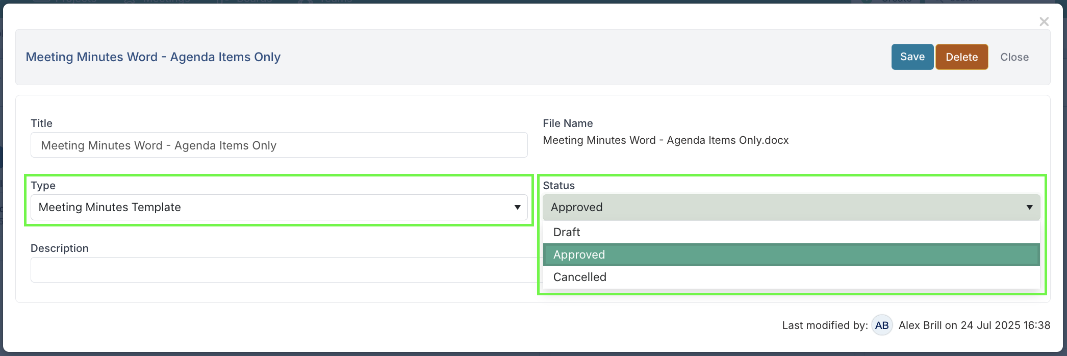 Answer: When you upload custom a meeting minutes template (Administration Console > Reporting Templates), by default it uploads as a draft.
