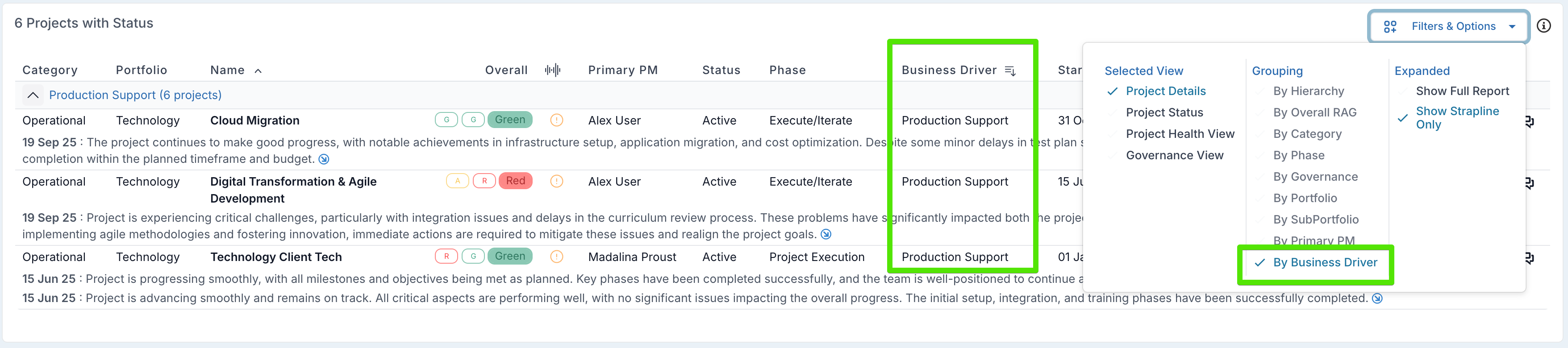 Project Health Dashboards: A new Business Driver column has been added to the Health Summary table, along with a Group by Business Driver option across all dashboard views. This enhancement makes it easier to review project performance and alignment in the context of your organisation’s key business priorities.