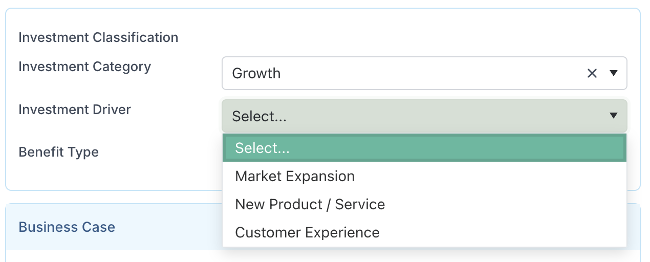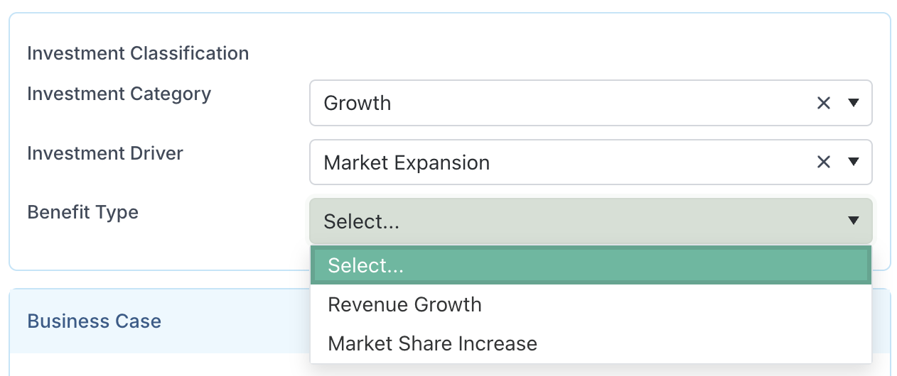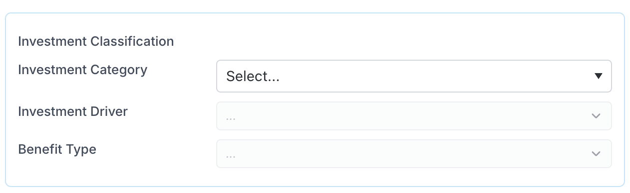 When entering a value, the cascade is completed from top to bottom. Users first select an Investment Category. Once selected, the Investment Driver field becomes active and only shows the drivers valid for that category. After choosing an Investment Driver, the Benefit Type field is enabled and filtered to show only the benefit types associated with that driver. This guided flow ensures users can only select valid combinations and makes it clear which information is required at each step.