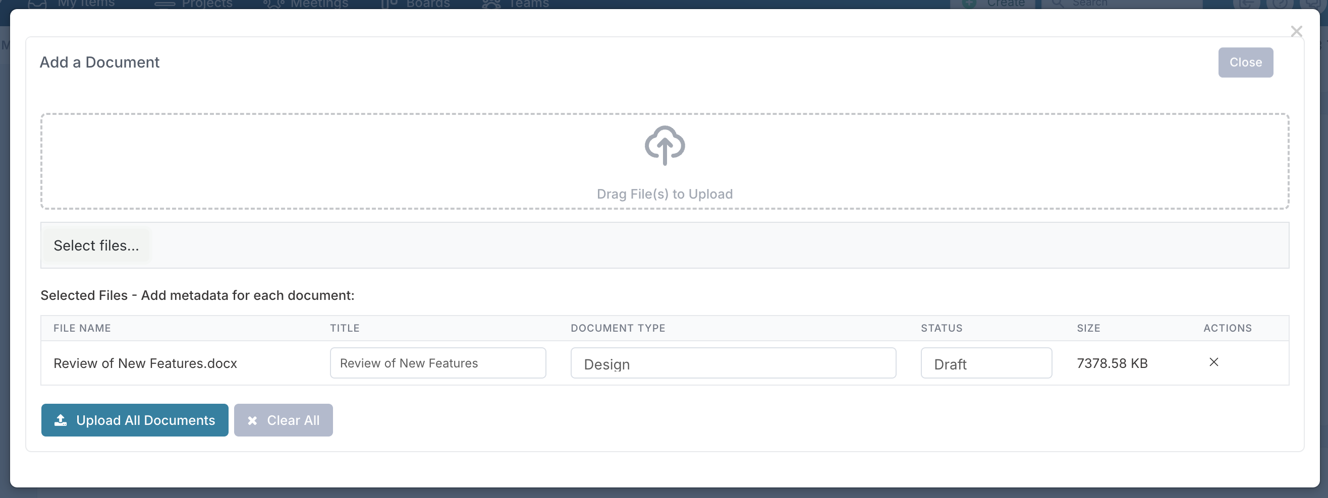 You can now set the title, document type, and document status at the point of upload, removing the need to edit the document afterwards. This streamlines document management and ensures files are correctly classified as soon as they are added.