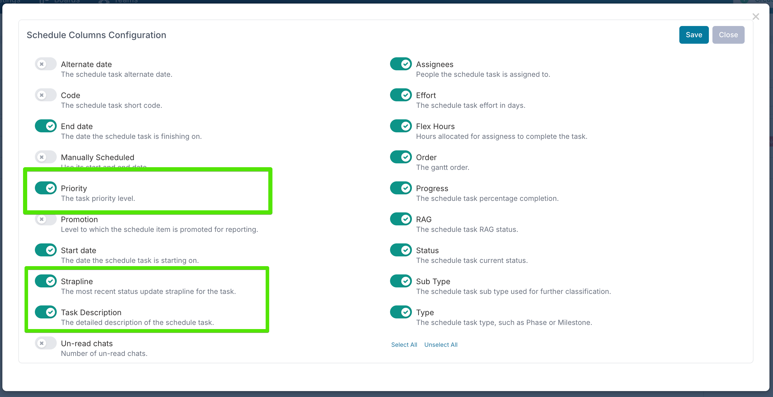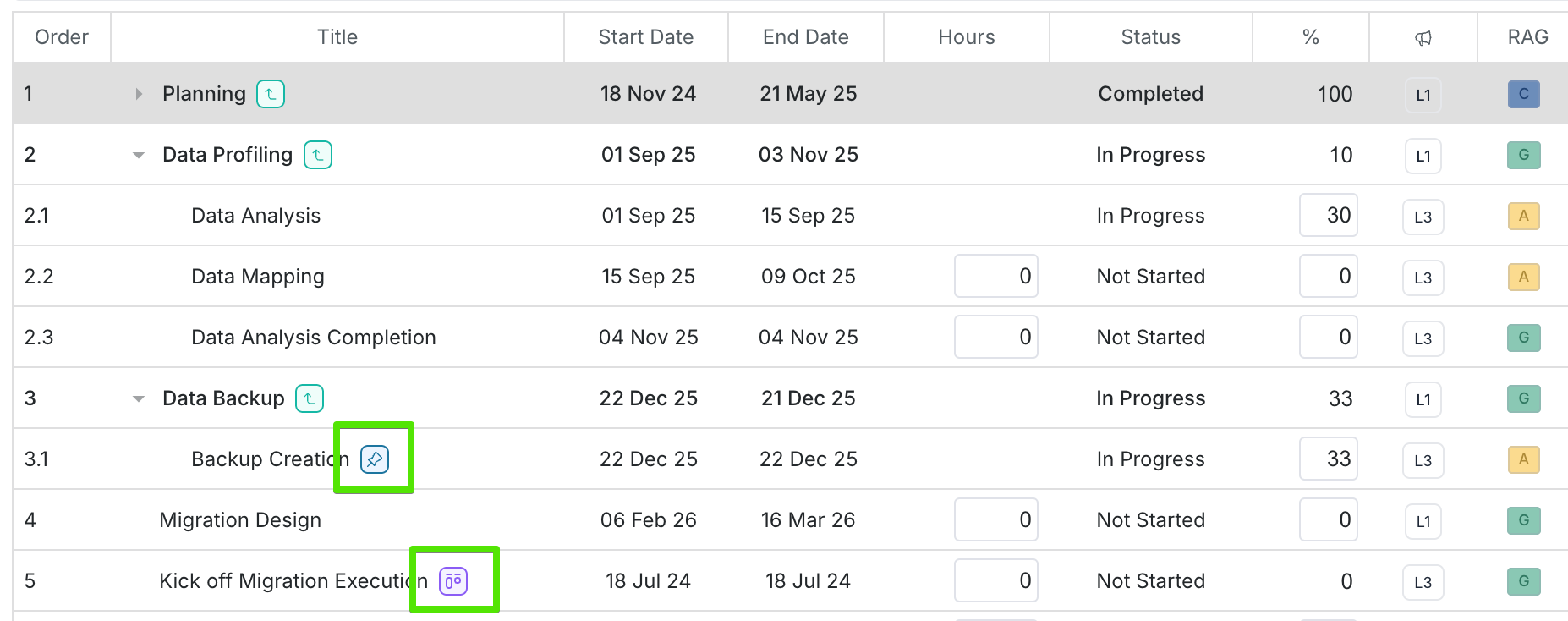 RAG Strapline Column: Surfaces the latest status-update strapline for each task so you can quickly understand current progress. Hover to see the full message.