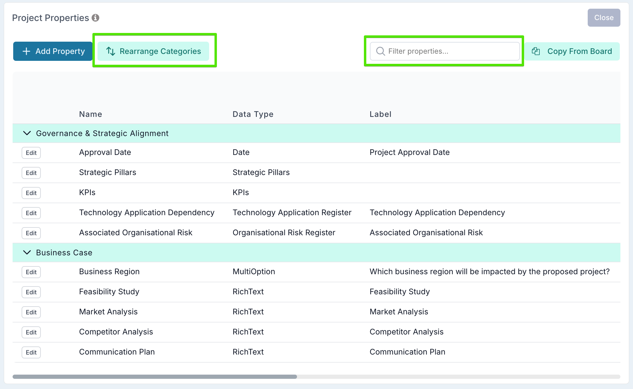 Move properties between categories by dragging them from one category to another, making it simple to reclassify properties as your governance model evolves.