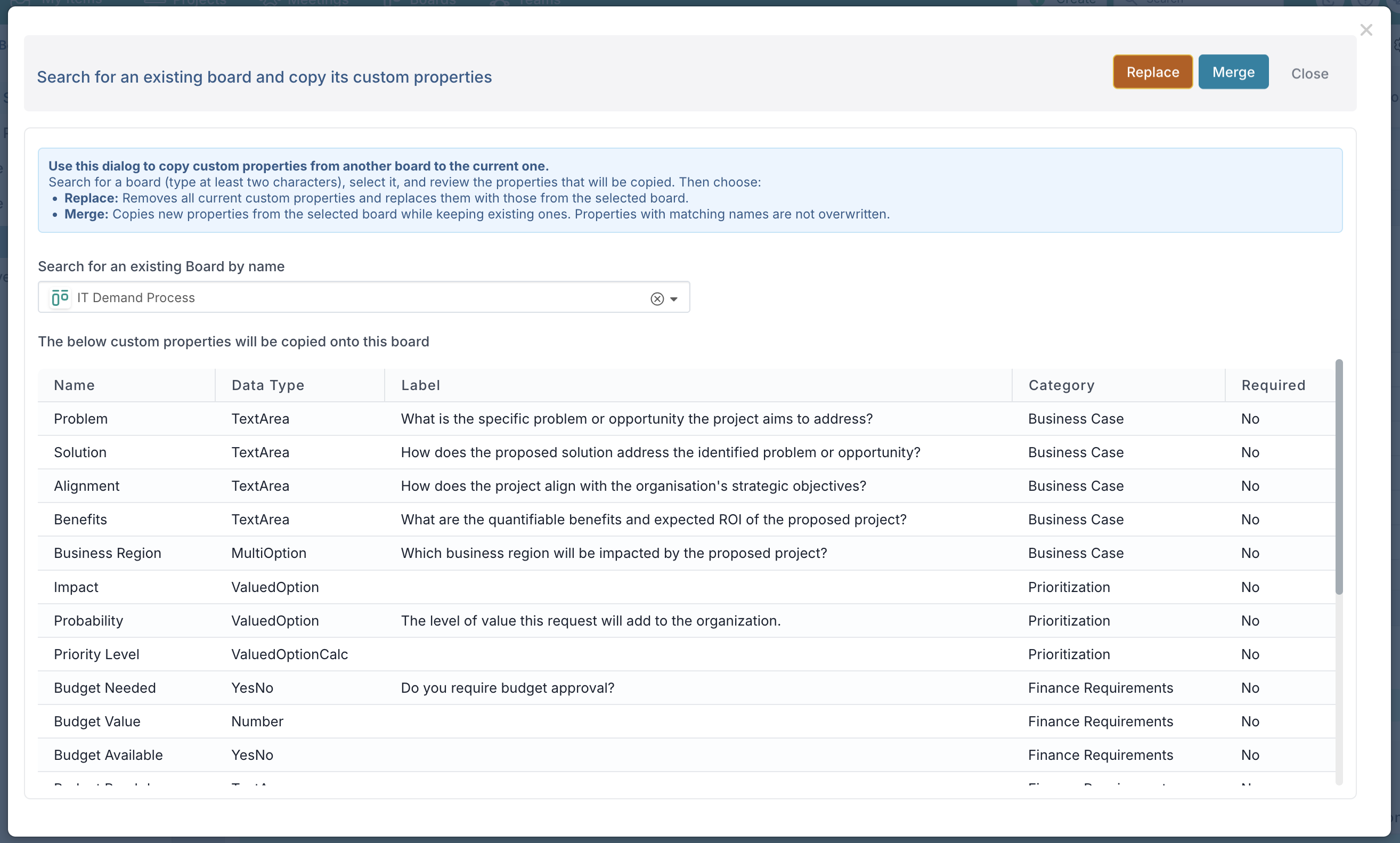 You can now copy custom properties directly from an existing board into another board or into project properties, making it much easier to maintain consistent data definitions across intake workflows and project workspaces.