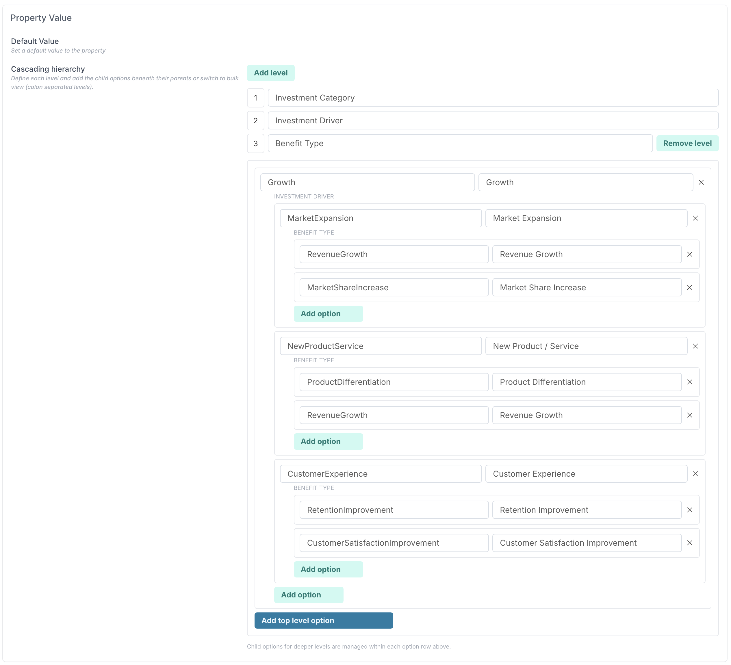 To create a cascading property, set the Data Type to Cascading Option and define your hierarchy by adding the levels you need — for example: