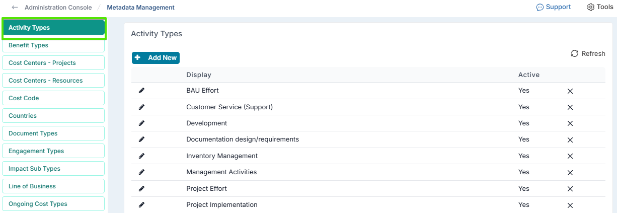 These form a standardised list of activities for all timesheet entries and are configured from the Metadata Management page.