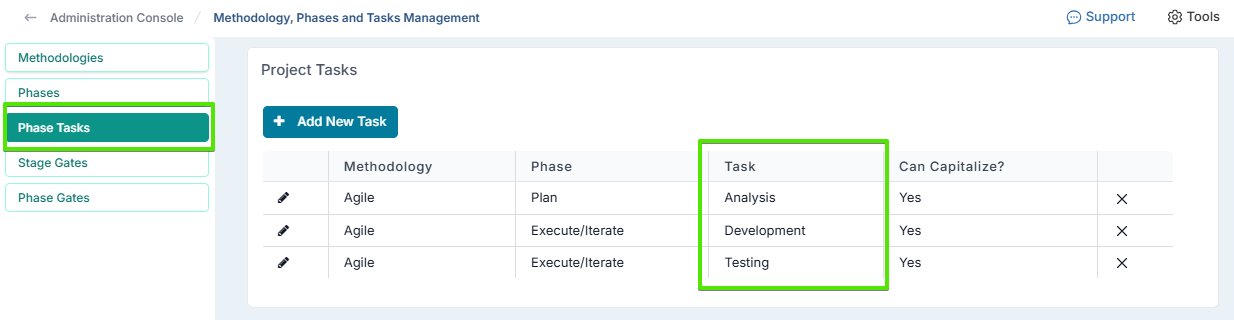 Phase tasks serve a different purpose. They determine which types of work are eligible for Capex during each phase of a project and are configured in the Methodology Phases & Tasks admin page.