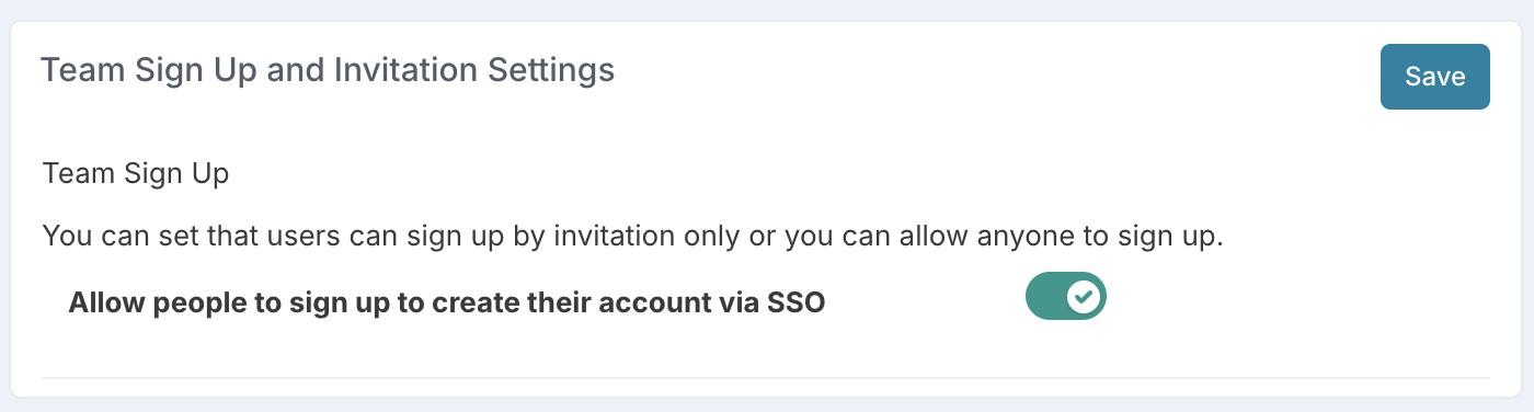 Once SSO is in place, you need to enable self-registration via SSO. Go to the Team Sign Up page (accessible from the Administration page) and switch on ‘Allow people to sign up to create their account via SSO’.