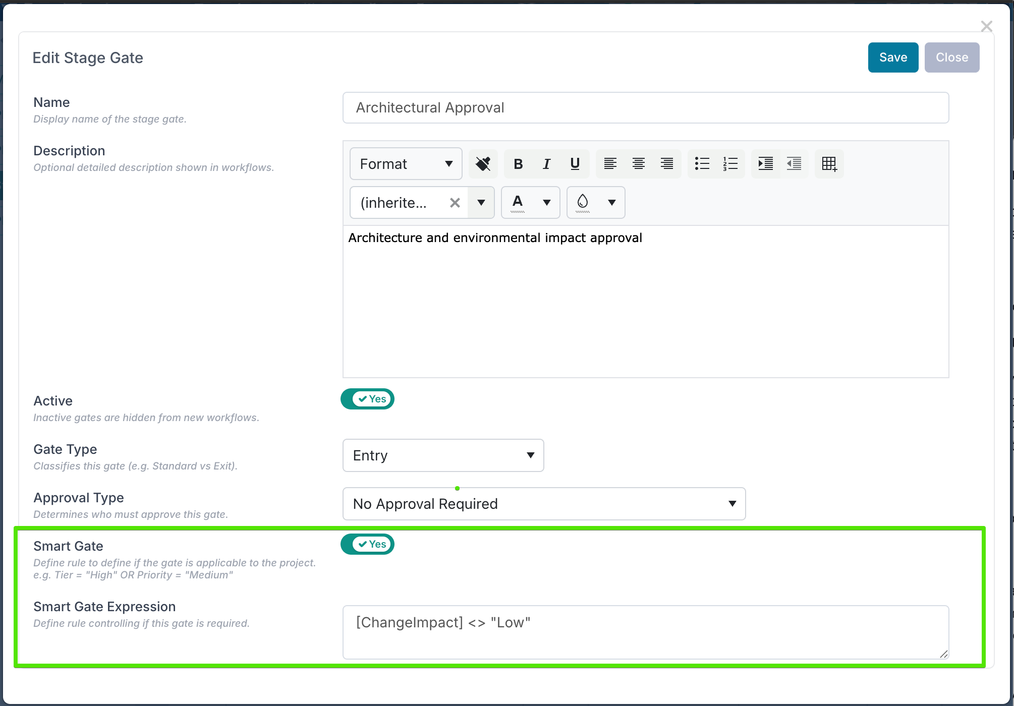 In the above example, the Architectural Approval gate will only be required for projects where the impact of the change is High or Medium.