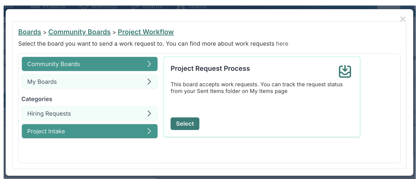 the list of boards shown when users select Create → Work Request.