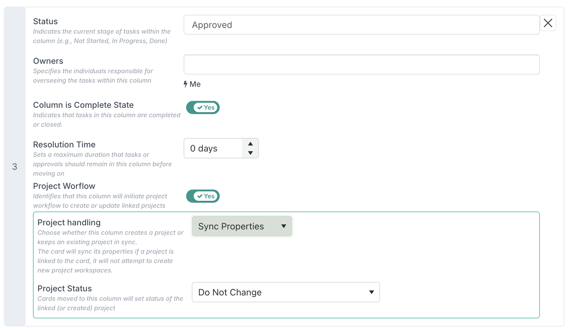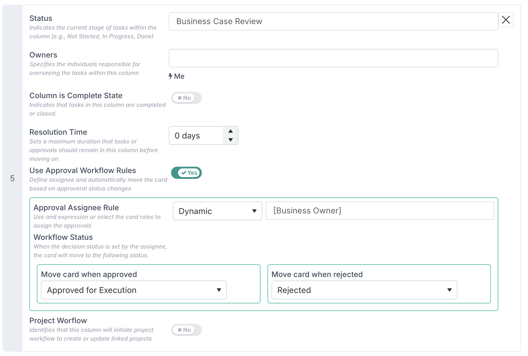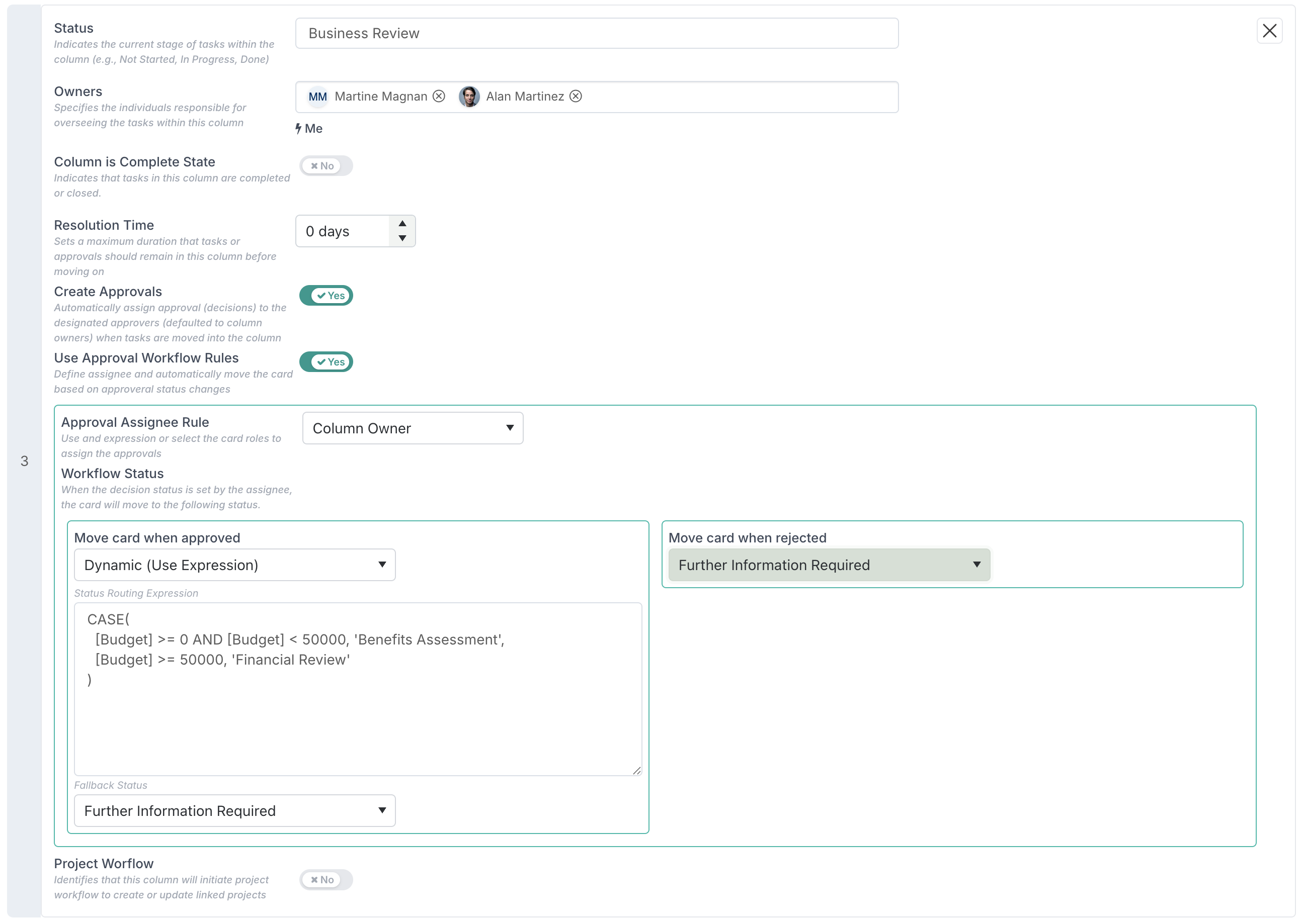 This behaviour is configured directly at column level on the board. When defining a column, you enable Approval Workflow Rules, specify who the decision approvers are (using static or dynamic roles), and then define how the card should move based on the decision outcome.