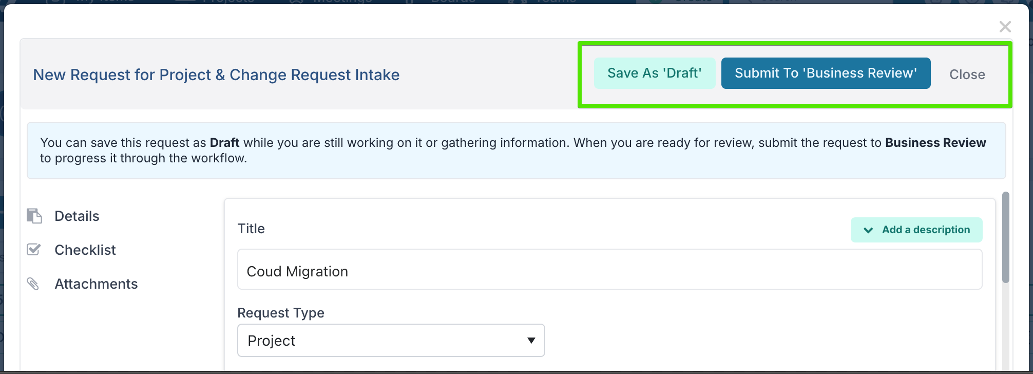 This is particularly useful for intake scenarios where information needs to be gathered from different roles - for example, combining delivery details from a project manager, financial input from a PMO analyst, or technical context from a subject matter expert - before the request is ready for review.