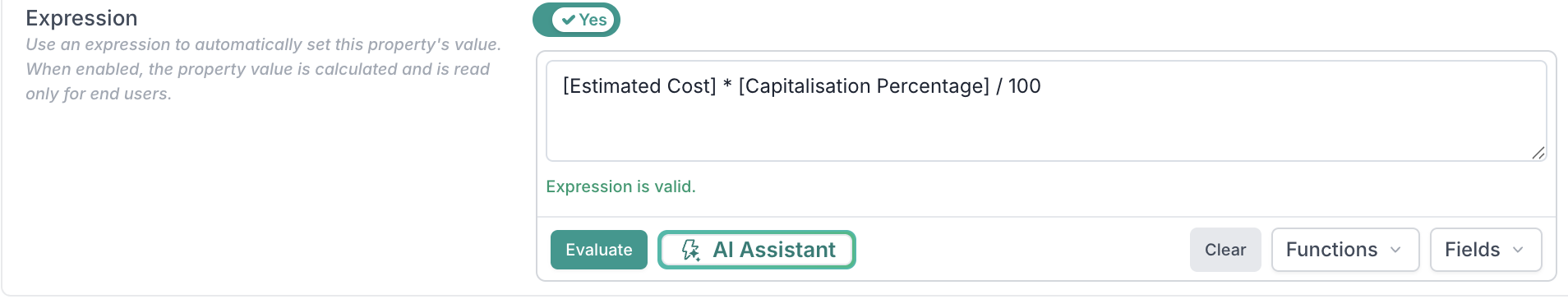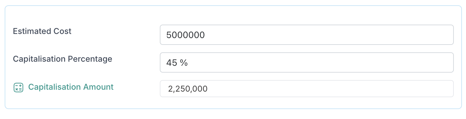 A third field, Capitalised Amount, is automatically calculated using an expression