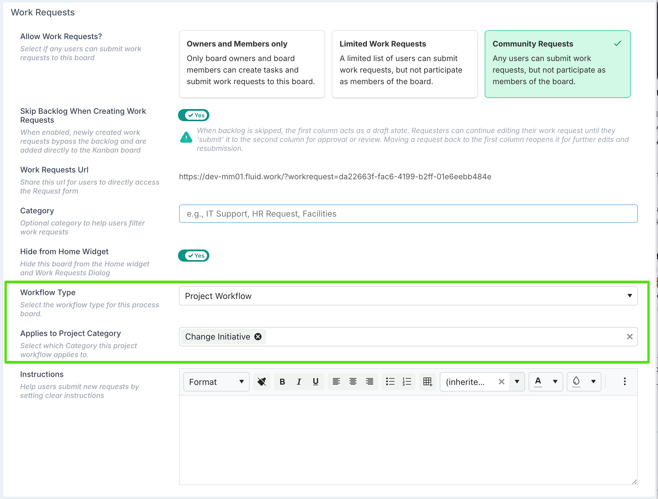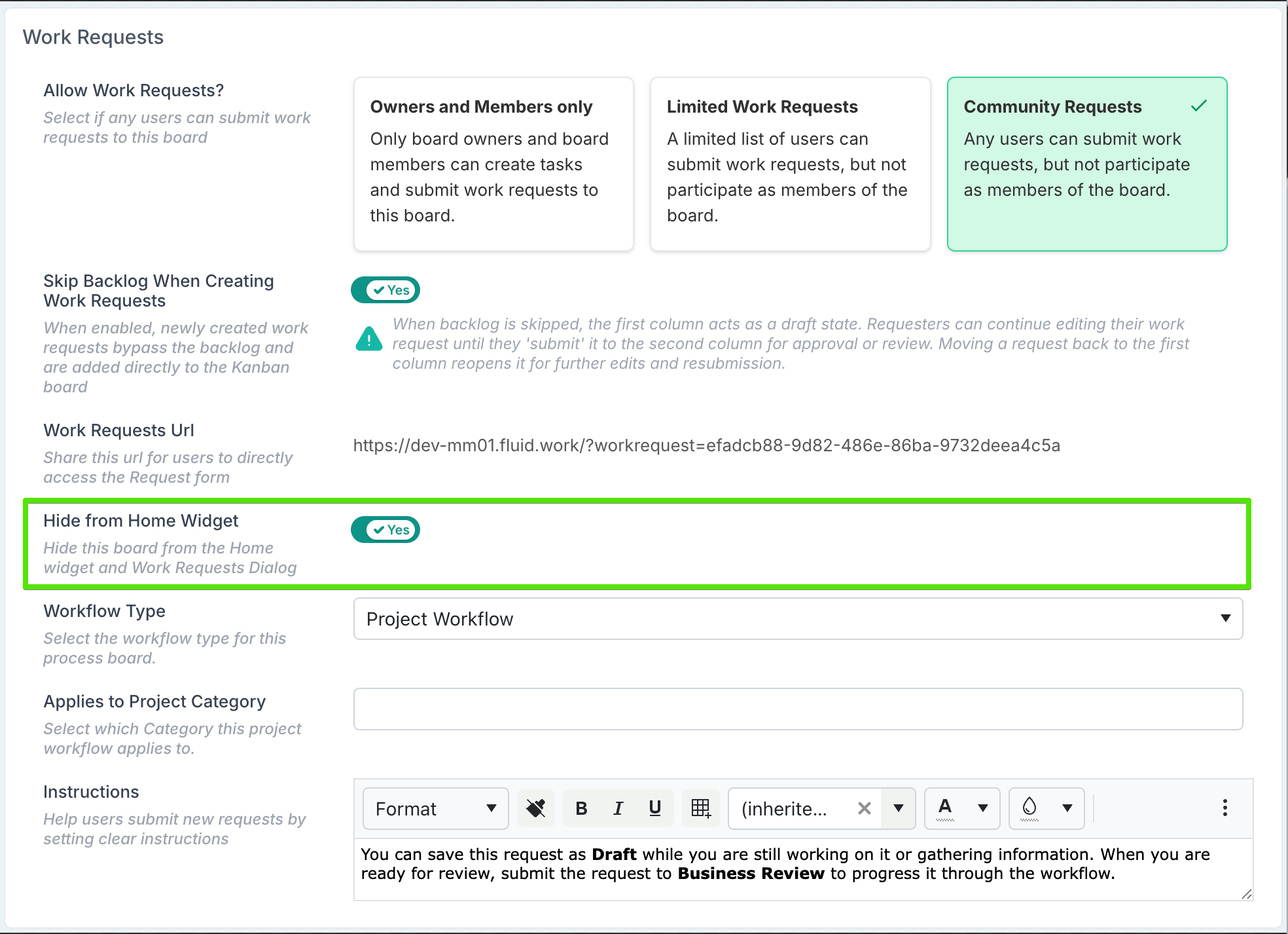 If the board is hidden from the Home widget, the workflow becomes project-contextual and can be initiated from within a project. In this mode, the Project Category setting controls which projects can initiate a workflow request: